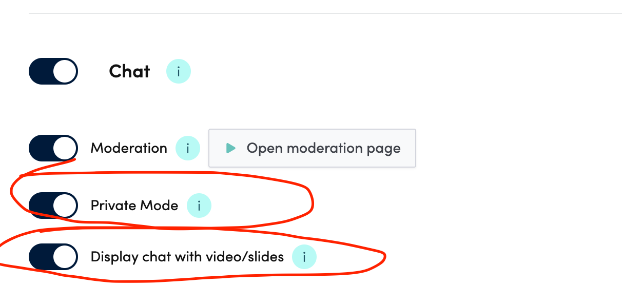 Private mode makes all chat messages private. In private mode, there is no public chat – viewers can only talk with moderators and producers. It is recommended to also toggle on Display chat with video/slides setting! There is also a new tab in Chat Moderation which is called Private. There it is possible to respond to private messages. However, the tab is only visible when Private Mode is on.